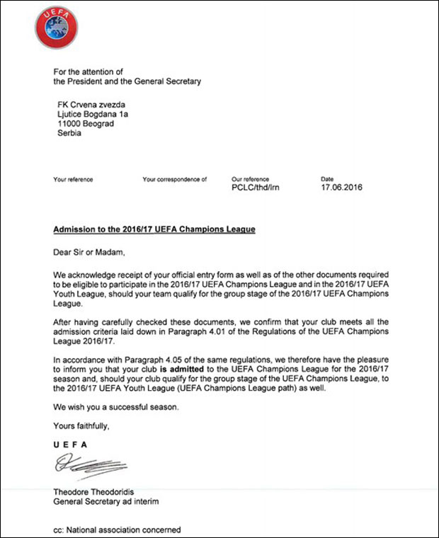 Ovim pismom Evropska fudbalska asocijacija obaveštava beogradski klub da su ispunjeni svi uslovi za nastup u Ligi šampiona, ukoliko plasman izbore na terenu kroz kvalifikacije.
