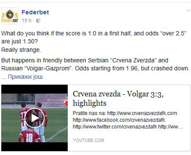 Pored toga, drastičan pad kvote na igru 3+ (tri ili više golova) u ruskim kladionicama podstakle su sumnju "Federbeta", koji je na svojoj fejsbuk strani objavio link sa golovima s utakmice, propraćen tekstom: