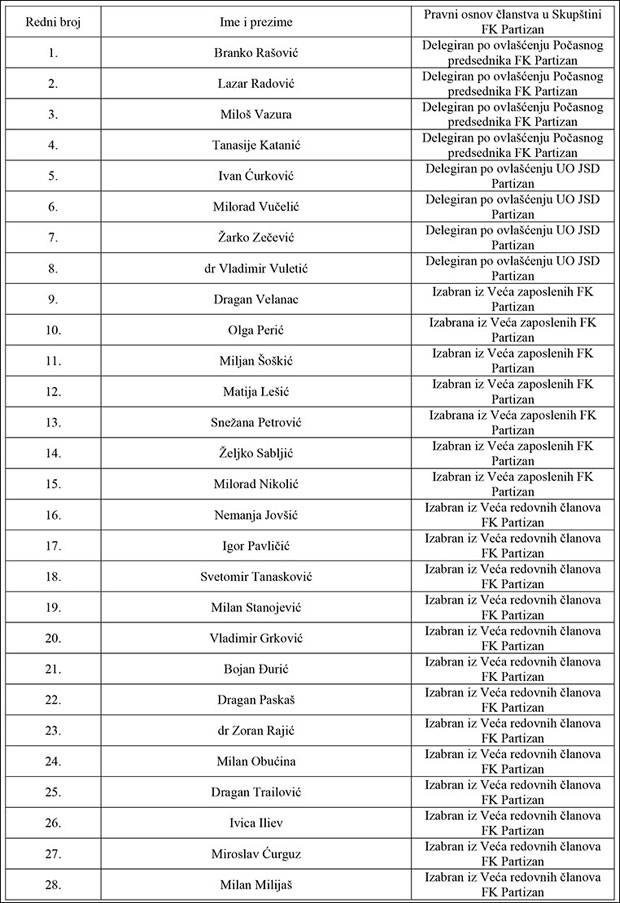 Imajući u vidu čl. 35. Statuta FK Partizan, Klupskoj izbornoj komisiji su pristigli predlozi za delegirane članove Skupštine od strane Počasnog predsednika FK Partizan, Upravnog odbora JSD Partizan i Veća klubova prijatelja i navijača FK Partizan.