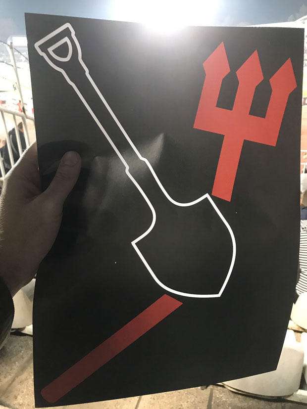 A kada je Grobar našao đavolji trozubac rešio je da ga slomi. Kartoni sa slikom na kojoj lopata lomi crveni bodež bili su podignuti iznad glava navijača i poslali poruku protivniku