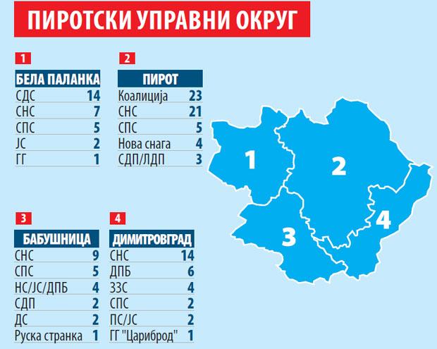 PIROT - Srpska radikalna stranka ni u jednoj od četiri opštine Pirotskog okruga neće učestvovati u lokalnoj vlasti. Osim Pirota i Bele Palanke, u kojima su pobedili dosadašnji nosioci vlasti - "Koalicija za Pirot" i "SDS-Goran Miljković" - u Dimitrovgradu i Babušnici su trijumfovali naprednjaci. V. Ć.