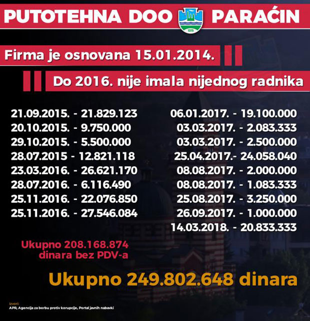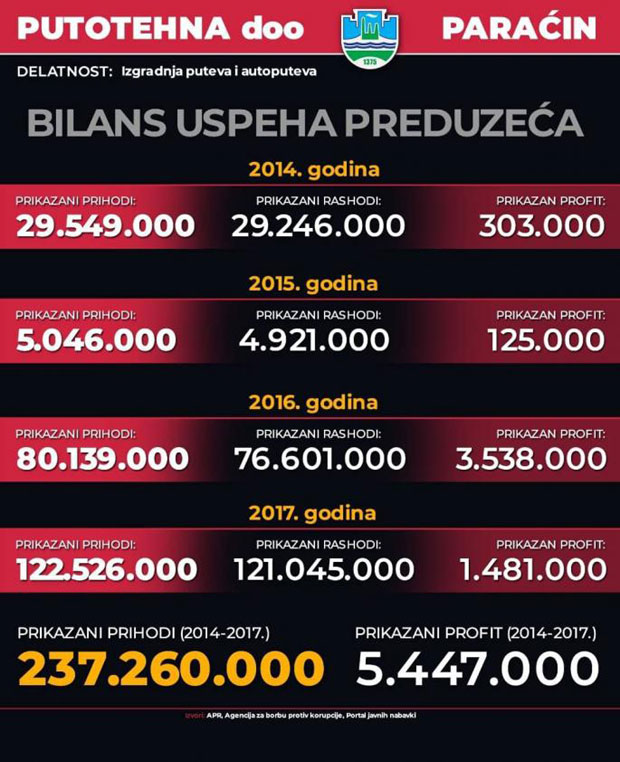 Inače, prema podacima iz APR Putotehna doo iz Paraćina je u periodu od 2014.-2017. godine prihodovala 237.260.000 dinara. Kako smo saznali firma Putotehna tokom 2014. i 2015. nije imala zaposlene radnike, a tek krajem 2016. je zaposlila prve radike. Postavlja se pitanje kako je firma koja se bavi putarskim radovima, uspevala da završi poslove i da izgradi puteve kada nije imala zaposlene? Tako, 2014. godine kada je osnovana Putotehna je prihodovala 29.549.000, a rashodovala 29.246.000 dinara. Naredne dve godine Putotehna je radila takođe bez ijednog zaposlenog, ali je za te dve godine prihodovala preko 85 miliona dinara, a rashodovala preko 80 miliona dinara bez obzira na to što nije imala nijednog zaposlenog. 2017. godine prihodi Putotehne su značajno porasli na čak 122 miliona dinara dok se profit smanjio na samo milion i po dinara. Prema ovom ispada da je Putotehna za četiri godine zaradila samo 5,5 miliona dinara ili 2,3 posto od ukupnih prihoda, što je krajnje čudno za ovu vrtu delatnosti gde se profit kreće u iznosu većem od 10 procenata. Kod ovog preduzeća nije samo to čudno već je i čudno kako su uspevali da pobeđuju na javnim nabavkama bez radnika koji su mogli da garantuju završetak posla.