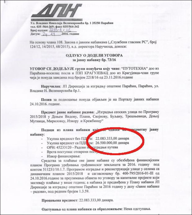 Putotehna DOO zajedno sa PZP Kragujevac koja ima 100 zaposlenih na osnovu reči direktora JP Direkcije za izgradnju Paraćina Aleksandra Milojkovića inače bila je jedini ponuđač na pomenutom konkursu za izgradnju seoskih ulica.