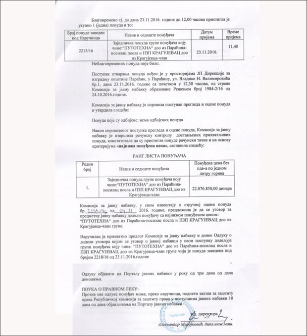 Na priloženim slikama možeti videti odluku o dodeli ugovora:
