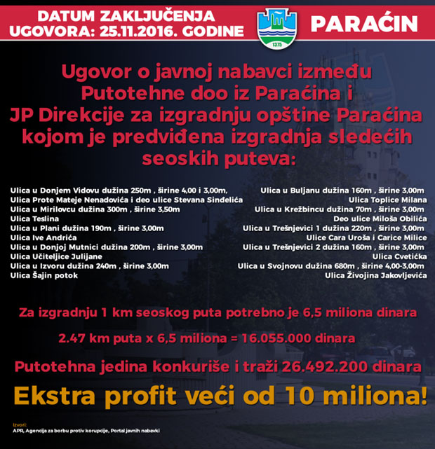 Izgradnju deset ulica – mahom ćorsokaka – opštinska vlast predvođena novim potpredsednikom DS-a Sašom Paunovićem platila je pomenutom preduzeću više od 26 miliona dinara. S obzirom na to da asfaltiranje jednog kilometra seoskog puta, prema zvaničnim procenama Građevinskog fakulteta, košta oko šest i po miliona dinara, nameće se zaključak da je Putotehna zahvaljujući unosnom ugovoru sa Direkcijom za izgradnju samo na tom poslu ostvarila ekstra profit veći od 10 miliona dinara!