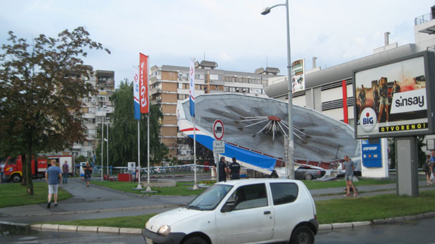 KROV pumpe NIS-a na Bulevaru cara Lazara u Novom Sadu ,koju Novosađani zovu „Mala pečurka“, srušio se u petak oko 18 časova tokom jakog naleta vetra i kiše.