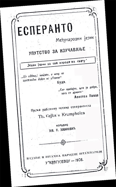 MEĐUNARODNI jezik u Srbiji postoji od 1908, kada je Narodna štamparija u gradu na Lepenici odštampala prvi udžbenik za esperanto na Balkanu. Autor je bio Jovan P. Jovanović, kasnije i prvi čovek Kragujevca gde je, između dva svetska rata, delovalo i Radničko esperantsko društvo.