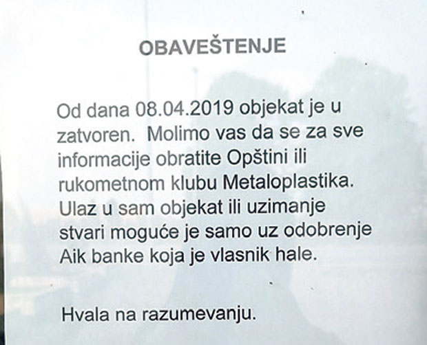 Zatvorena trofejna sala "Zorka", koju je lokalna samouprava bila zakupila od AIK banke. Da li dogovor sa Metaloplastikom i saopštenje za javnost smiruju strasti?