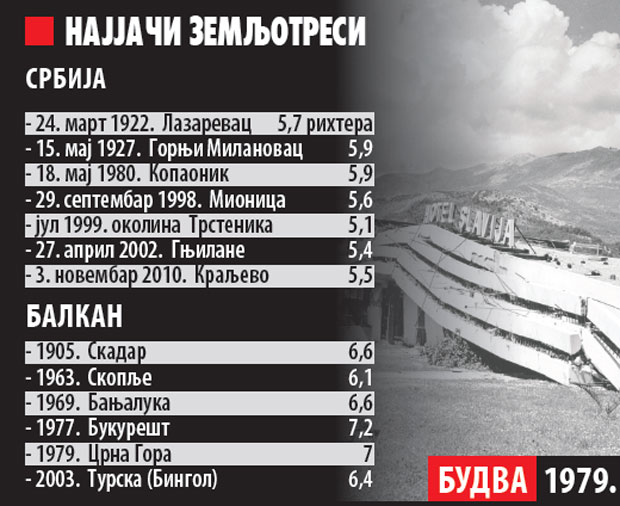 - Znamo mesta gde se mogu dogoditi zemljotresi, ali ne znamo kada će se dogoditi - kažu u Seizmološkom zavodu. - Prema procenama ugroženosti, žarišna mesta u Srbiji, sa najviše energetskog potencijala su zone - Svilajnca, Rudnika, Kopaonika, Mionice, Vranja, Jagodine, Vitine, Trstenika. Dosadašnje iskustvo pokazuje da su na našim prostorima najjači zemljotresi bili do šest stepeni Rihterove skale, a u poslednjih stotinak godina dogodilo se oko 40 zemljotresa jačih od 5 stepeni.