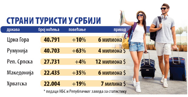 Podaci o broju noćenja turista u tabeli su za prva dva meseca 2018. Ako prihod koji su po podacima NBS doneli turisti iz pojedinih država podelimo sa brojem noćenja turista iz tih država dolazimo do podatka o prosečnoj dnevnoj potrošnji turista, a ona bi bila kako sledi; Rumunija 98 $/dan, Crna Gora 147 $/dan, Makedonija 267 $/dan, Hrvatska 318 $/dan, Republika Srpska 433 $/dan. Malo visoke, da ne kažem previsoke prosečne dnevne potrošnje turista iz država Ex-YU.