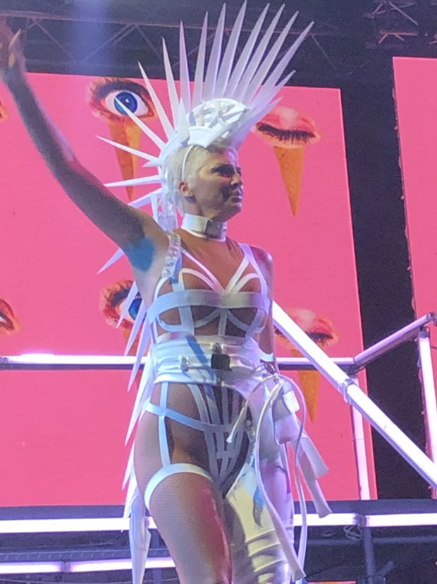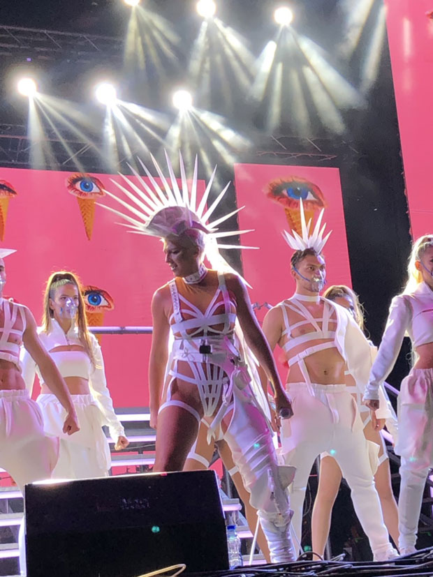 Pevačica je na sebi imala seksi kostim prepun belih tračica, a ono što je primetno jeste da na sebi nema gaćice. Ono što je iznenadilo mnoge je to da je na festival dovela i svoje dve ćerke Niku i Atinu.