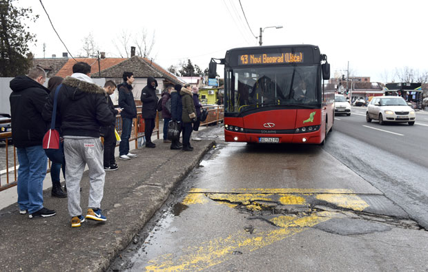 НАЈВЕЋА оштећења дуж Зрењанинског пута видљива су у близини стајалишта, а због огромних рупа које се испуне водом, путници не могу суви ни да уђу у аутобусе. Пошто дуж ове деонице нема тротоара, најугроженији су пешаци, школарци поготово.
