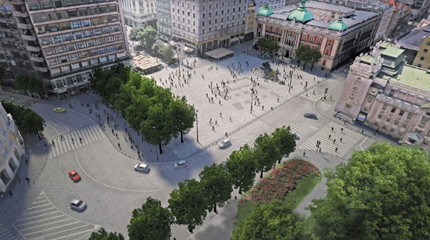 ОГРОМНА камена плоча ужарена под високим температурама. Овакву слику пред собом имају Београђани само двадесетак дана пред последњу клапу радова на реконструкцији центра Београда - Трга републике. Иако је тренутни изглед главног састајалишта престонице, према мишљењу појединаца, суморан и го без дрвећа, градски урбаниста Марко Стојчић обећава да ће Трг републике имати хлад.