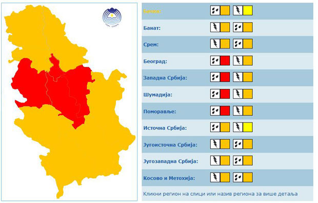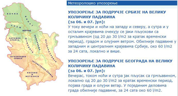У току вечери и ноћи на западу и северу, а сутра и у осталим крајевима очекују се јаки пљускови са грмљавином (од 20 до 30 l/m2 за кратак временски период), градом и олујним ветром. Обилније падавине у западним и централним крајевима Србије, око 60 l/m2 за 24 сата, локално и више.