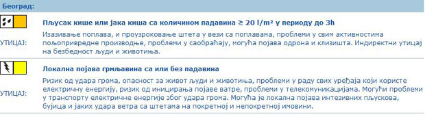 Вечерас, током ноћи и сутра јак пљусак са грмљавином, локално од 20 до 30 l/m2 за кратак временски период, појава града и олујни ветар. У појединим деловима града обилније падавине, за 24 сата око 60 l/m2.