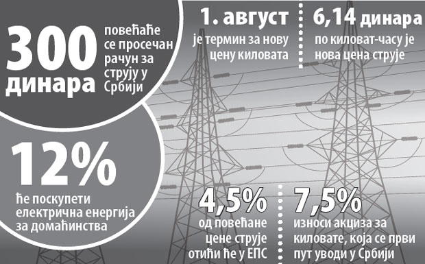 Рачун за електричну енергију грађани ће од почетка августа ће бити у просеку 300 динара већи. Од нове цене "Електропривреди" одлази 4,5, док ће држава кроз акцизу узети 7,5 процената