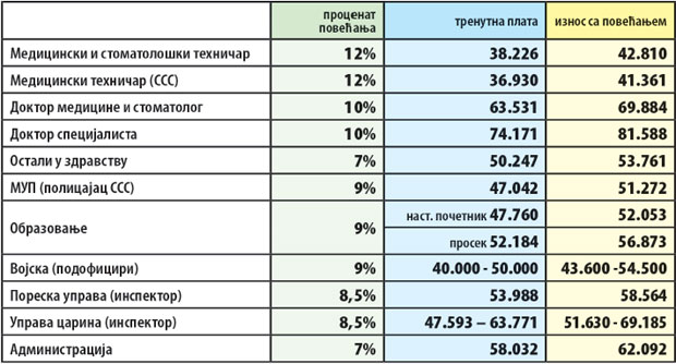 Највеће повећање, 12 одсто, обећано је медицинским и стоматолошким техничарима са средњом и вишом школом. Доктори медицине и стоматологије, али и доктори специјалисти очекују повећање од десет одсто. Осталим запосленима у здравству плате ће бити кориговане за седам одсто.