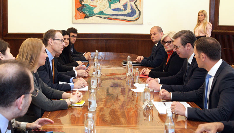 Председник Вучић и чланови делегације ММФ разговарали су и о предузећима од општег интереса, међу којима су јавна предузећа ЕПС и Ресавица, затим о приватизацији Комерцијалне банке и компаније Петрохемија, као и реформи пореске управе.