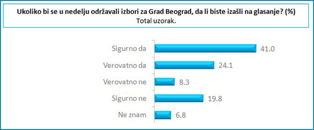 КАДА би се следеће недеље одржавали локални избори у Београду, 41% грађана се изјашњава да би сигурно, а 24,1% да би вероватно изашли. 8,3% се вероватно не би одазвало позиву, а 19,8% је оних који сигурно не би испунили грађанску дужност. Неодлучних по питању излазности је 6,8%.