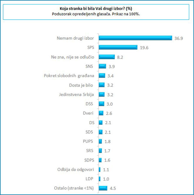 Грађани који су се изјаснили да би изашли на изборе и који су опредељени при избору странке којој би дали глас, додатну су упитани да се изјасне и по питању странке која би била њихов други избор. 36,9% Београђана се изјашњава да нема други избор, 8,2% је неодлучних по овом питању, док се као најчешће поменута странка јавља СПС са 19,6% навода. За 3,9% опредељених гласача други избор је СНС, за Покрет слободних грађана би се определило 3,4%, а по 3,2% Београђана у другом избору наводи Доста је било и ЈС. Остале странке помињу се у проценту мањем од 3%.