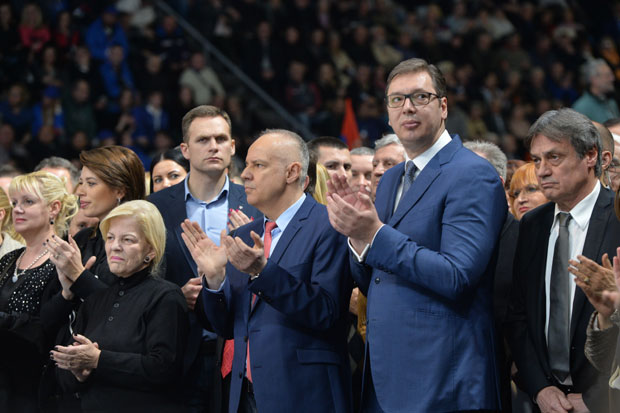 На самом почетку свог обраћања у препуној дворани „Пионир", Вучић је указао да су у хали спортисти Илић, Гуровић и Грбовић, и нашалио се да „нису играли пред оволиким бројем људи" у Пиониру.