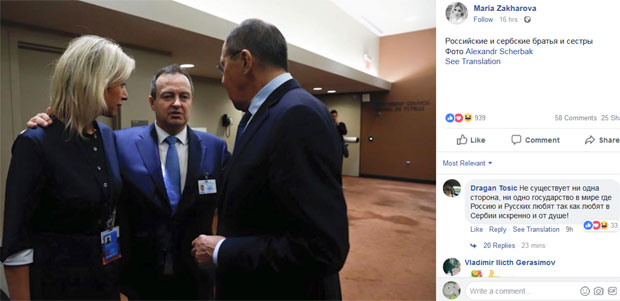 Портпаролка Министарства спољних послова Русије Марија Захарова објавила је на свом Фејсбук профилу фотографију са српским и руским шефовима дипломатије, Ивицом Дачићем и Сергејем Лавровим.