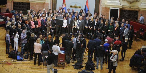 Посланици власти окупљени око Српске напредне странке најавили су на конференцији за новинаре да ће остати у згради парламента на Тргу Николе Пашића како би је бранили од насиља