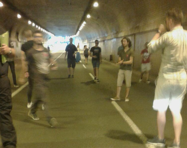 Испред тунела учесницима протеста се обратио новинар Срђан Шкоро који је рекао да је то тунел где комуналци ''избацују народ и не дозвољавају да се лепе налепнице'' и навео да је садашња власт ''најгора власт у историји Србије''.
