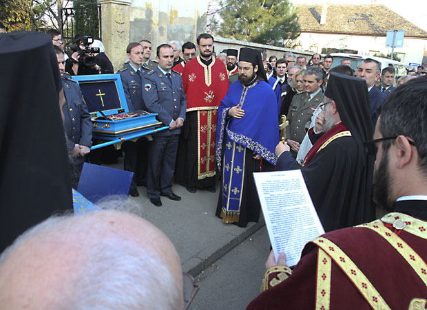Ту га је, по лепом сунчаном времену, дочекао велики број људи, а у свечаној литији до горње цркве а затим и до Саборне цркве, представници војске, полиције, средњошколци, чланови фолклорног друштва. У Саборном храму епископ сремски Василије са свештенством одржао је богослужење.