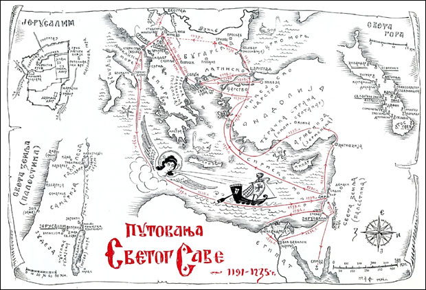 Сава путује између Свете Горе и Константинопоља, а кад Србији запрети пропаст од грађанског рата он се враћа кући да је спасе. Одлази у Никеју, где добија титулу архиепископа. Кад смири ситуацију у земљи, он одлази у Свету земљу где купује три манастира чији конаци постају обавезна станица руских и српских ходочасника. Током другог путовања у Свету земљу, Сава стиже до Синаја где ствара српски скрипторијум. Преваљује хиљаде километара кад се копном путовало пешке или на коњу, а по мору једрењацима.