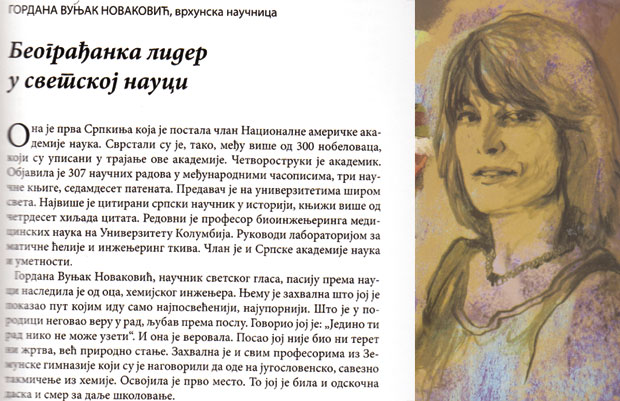 Али овде је тек почетак једне лепе и дирљиве приче. Она, "владарка" лабораторије у којој се истражује узгој хуманих ткива која помажу у регенерацији људских органа, није знала да је и сама у најновијој књизи "Новости" - "Оне су промениле Србију". У књизи која доноси седамдесет прича о изузетним Српкињама које су оставиле дубок траг и својом личношћу и делом у српској историји, посебан украс дају њихови портрети, исцртани руком и даром наше уметнице.
