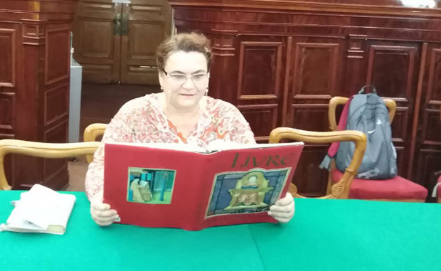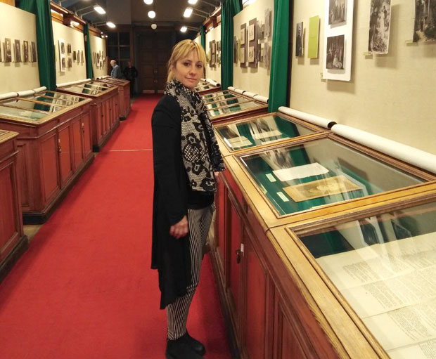 Јекатерина Крушељницкаја крај странице Мирослављевог јеванђеља