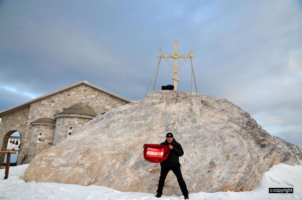 Он је био далеко испред велике групе Руса, који су на стазу по залеђеним стенама и снегу повели и тројицу дечака од око 12 година. Како је који од њих пристизао, прилазио је звонима на трему Храма Преображења, оглашавајући свој долазак и громким "С праздњиком" честитао празник Лазареве суботе, Врбице, дана који верујуће подсећа на Христову моћ да васкрсава мртве.