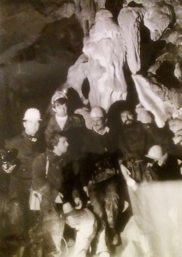 Спелеолози и ТВ камермани 1979. испод статуе Деда Мраза