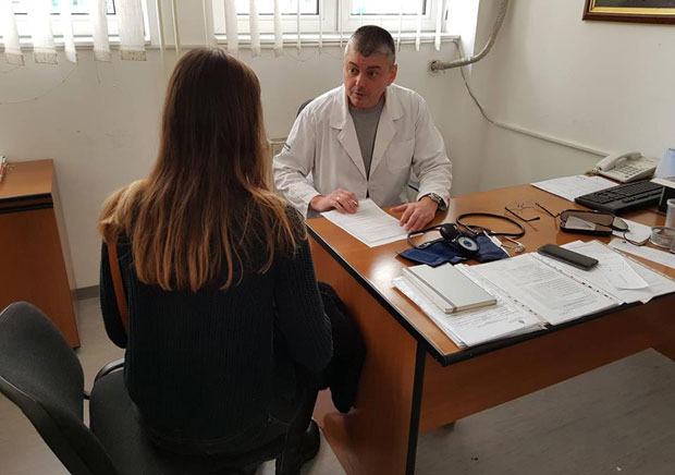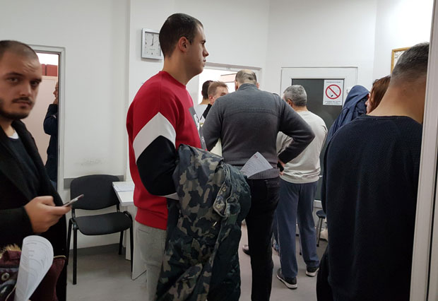 Ред се протеже од улаза до ординација и сви стрпљиво чекају и попуњавају формуларе пре него што их доктор прегледа.
