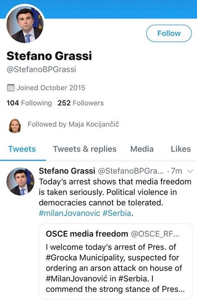 Шеф делегације Европске уније Сем Фабрици такође се огласио поводм хапшења председника општине Гроцка.