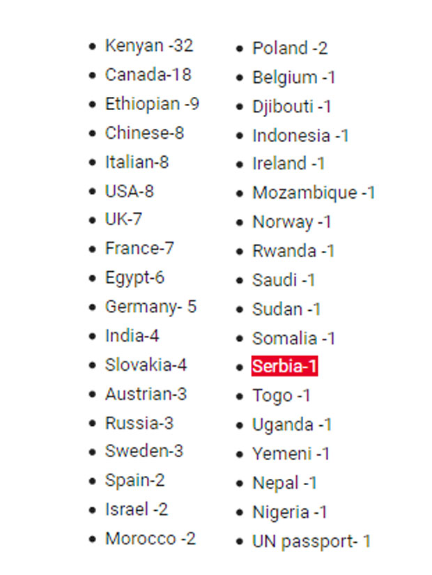 Међу путницима су била 32 држављана Кеније, 18 Канаде, девет Етиопије, по осам Италије, Кине и Америке, по седам британских и француских, шест египатских, пет холандских, те по четири индијска и словачка.