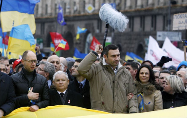 * На Мајдану, Јарослав Качински између Јацењука и Кличка у време рушења Јануковича