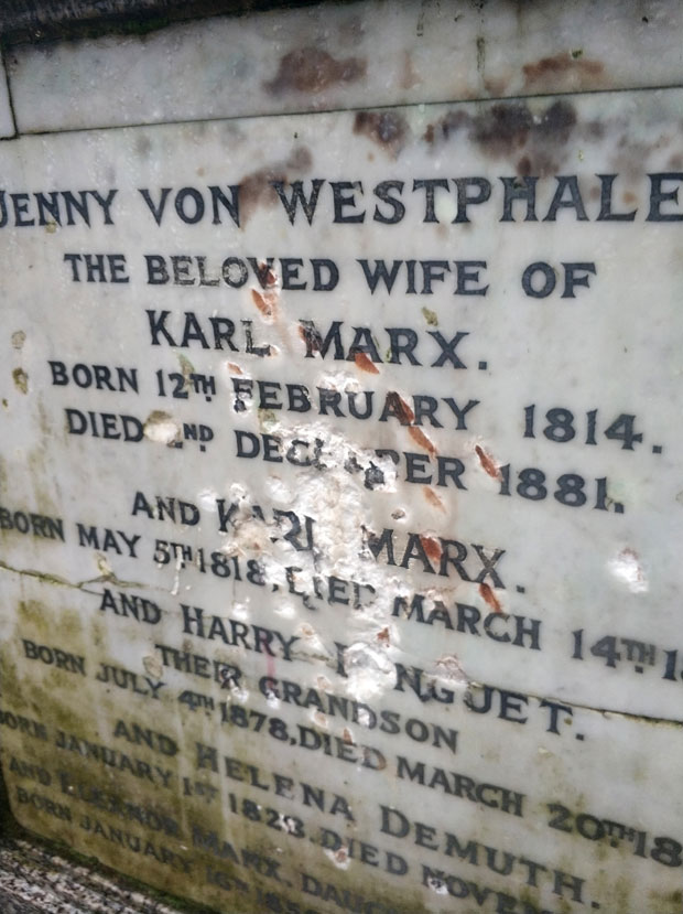 Фотографије са лица места показују оштећења епитафа Карлу Марксу, његовој жени и унуку.