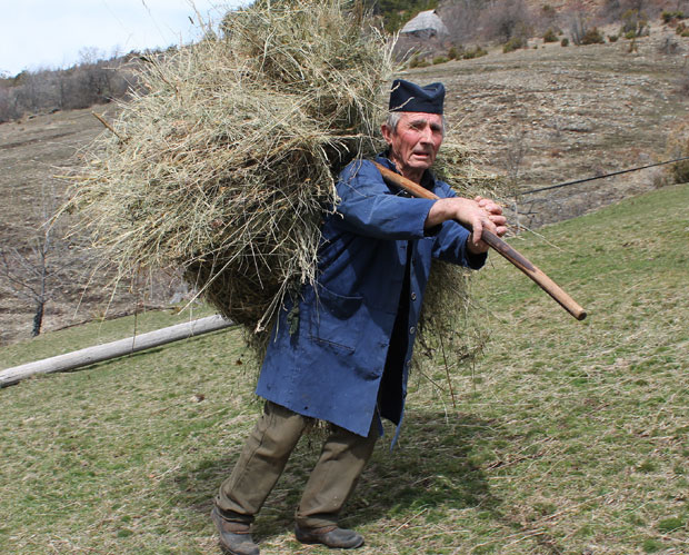 - Радили овако преци, навико сам, одмалена. Скоро цело сено зимус сам изнео кравама, а и немам запреге да га извучем. А за шта су друго сељаку леђа него за терета и зноја? - као да се правда старина што се мучи у одмаклим годинама у врлетима Медвеђег брда.