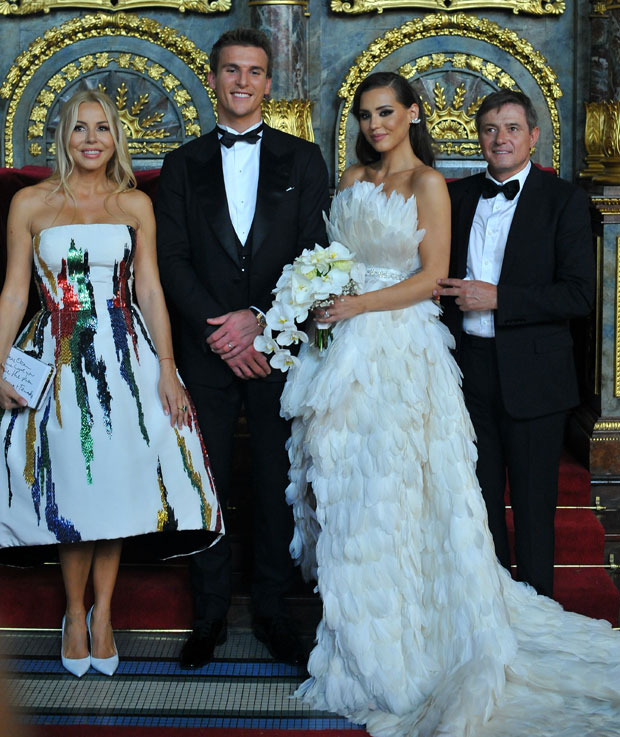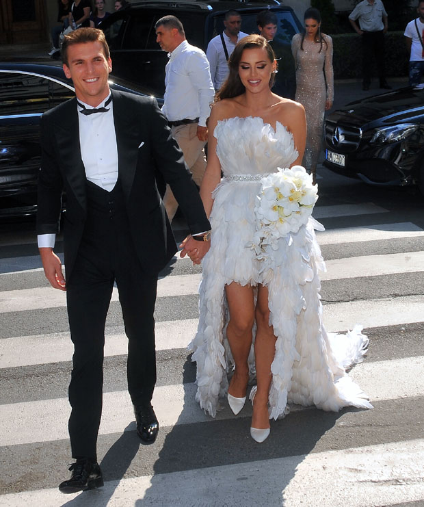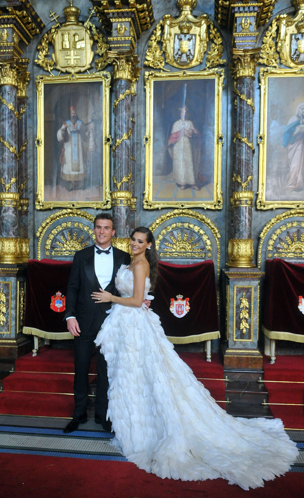 Ања и Уго су на венчање стигли нешто пре 16 сати у црном “мерцедесу”. Млада је блистала у раскошној белој венчаници од перја са дугим шлепом, а око струка је имала сребни каиш са кристалима.