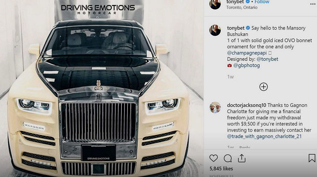 Репер Дрејк се одлучио за Rolls-Royce Phantom у издању Mansoryја које носи име Bushukan по специфичној боји тропског воћа. А тај ауто уз двобојни екстеријер и обиље луксуза у кабини, има и нови орнамент.