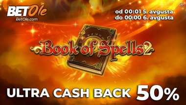 Ali, obratite pažnju! U konkurenciju za 50% keš-beka ulaze samo igre realnim novcem. Freebet kao i besplatni spinovi neće učestvovati u promociji. Ukoliko tokom obračunskog perioda izgubite bilo koju svotu novca igrajući „BOOK OF SPELLS 2“, BetOle će vam polovinu tog novca vratiti!