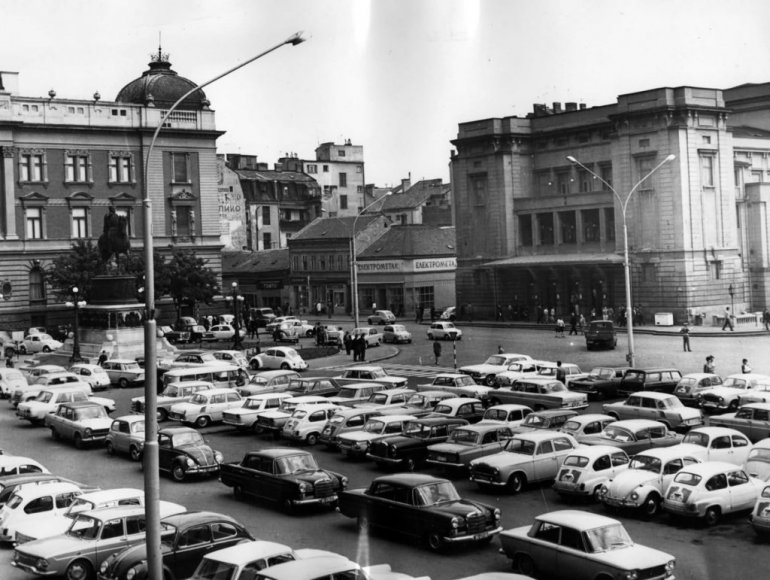 Ispred Narodnog pozorišta stajao je veliki prostor koji su u to vreme popunjavala motorna vozila tadašnjih Beograđana.