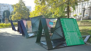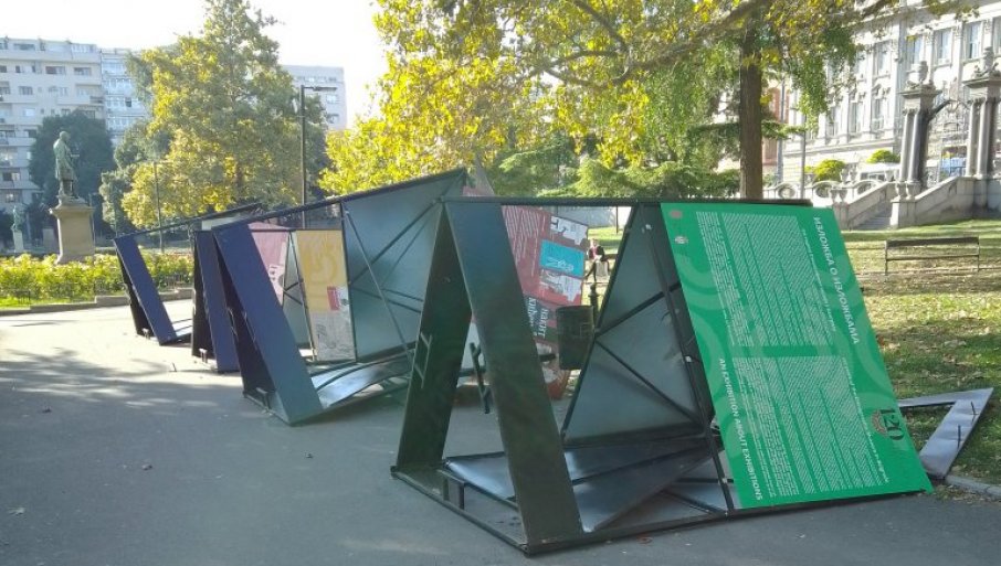 NEPOZNATI vandali u noći između utorka i srede porušili su četiri metalne konstrukcije u Studentskom parku na kojima je bila postavljena izložba povodom 120 godina Etnografskog muzeja.