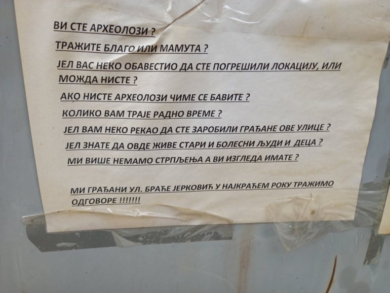 Građani više nemaju strpljenja. Na mašinama i ogradi gradilišta osvanula su pitanja nadležnima: "Da li ste vi arheolozi? Tražite blago ili mamute? Ako niste, čime se bavite? Je l' vam neko rekao da ste zarobili građane ove ulice u kojoj žive stari, bolesni ljudi, deca? Mi više nemamo strpljenja i tražimo odgovore."