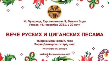 VEČE ruskih i ciganskih pesama biće održano sutra u Kulturnom centru "Čukarica". Program počinje u 20 časova, a izvešće ga pevačica Mirjana Marinković i Zoran Dimitrov, koji će je pratiti na gitari.