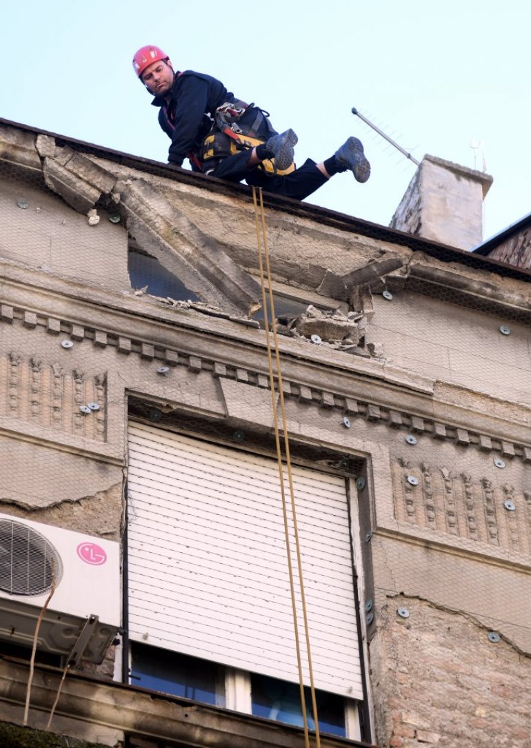 Parkirani automobili ispred ulaza, koji su bili prepreka za izvođenje radova, uklonjeni su, a alpinisti su se popeli na krov i bezbedno obrušili zid koji je visio.