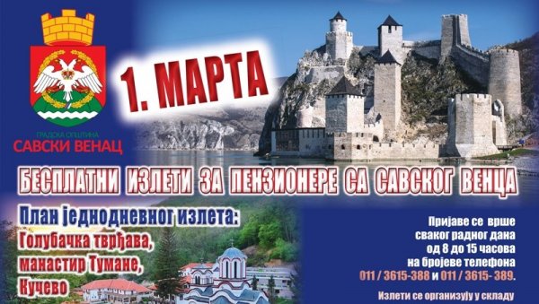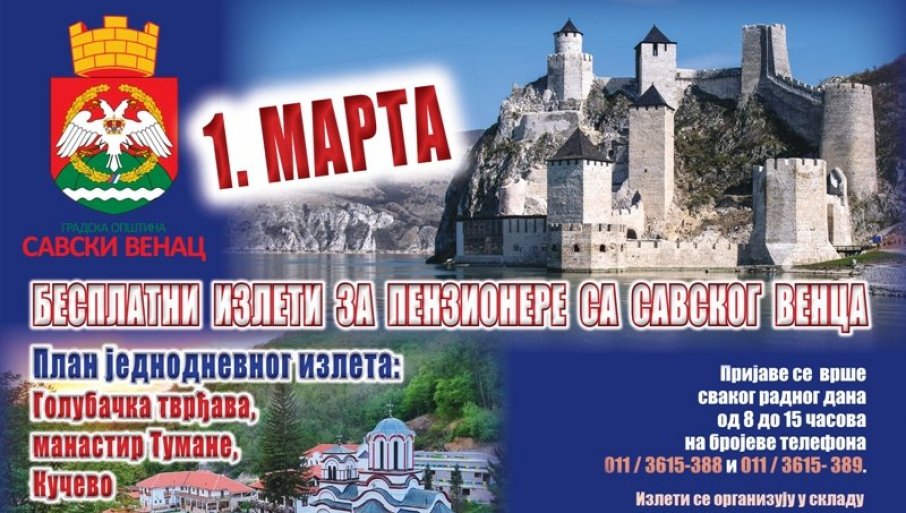 Zainteresovani penzioneri za besplatan izlet mogu da se prijave svakog radnog dana od 8.00 do 15.00 časova na brojeve telefona 011/3615-388 i 011/3615-389.