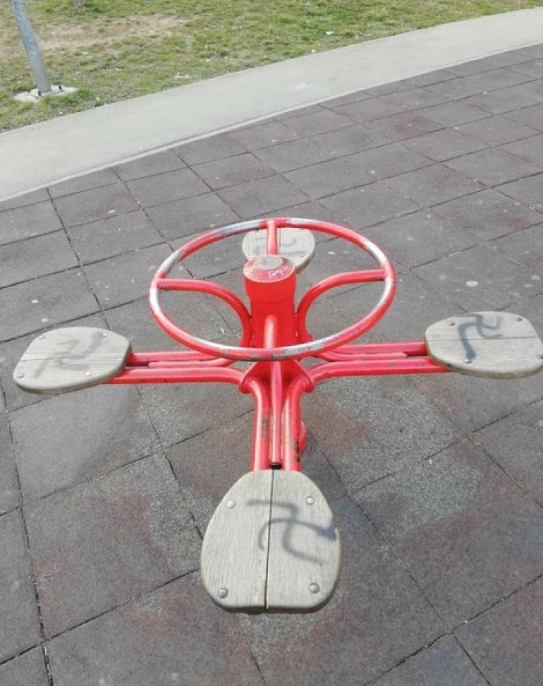 Crni kukasti krstovi bili su ispisani duž tobogana, na vrteški, kanti za smeće i betonskoj stazi.